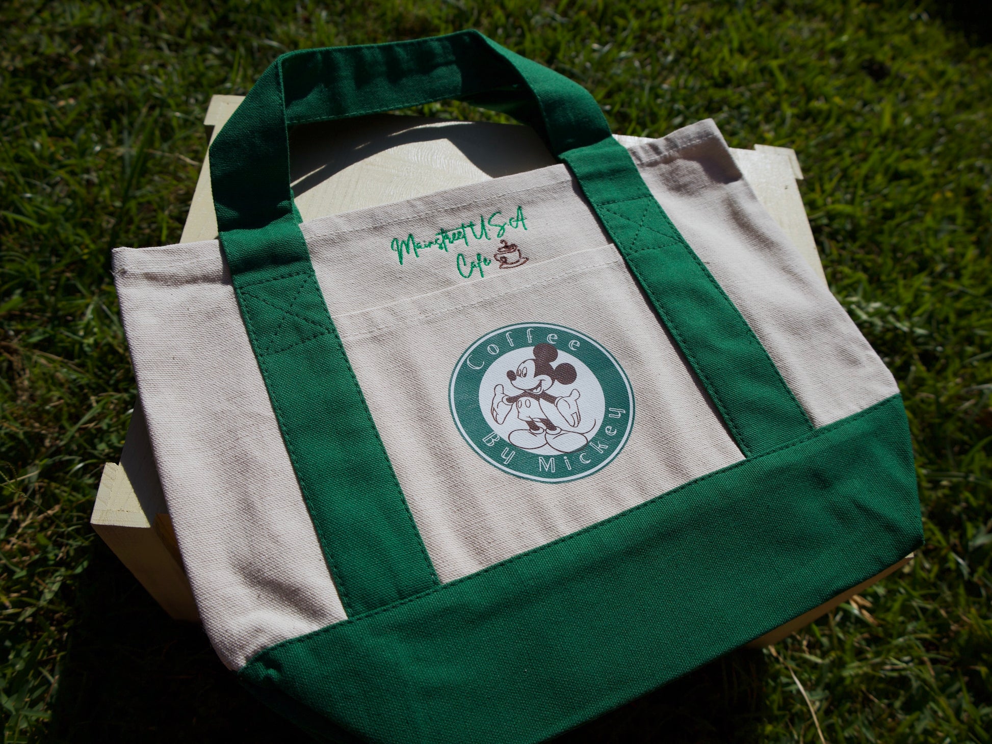 Green mini tote bag. Design includes "Coffee by Mickey" with Mickey image on front pocket. "Mainstreet USA Cafe" embroidered on front. This bag is perfect for Mickey fans who obsess over coffee.